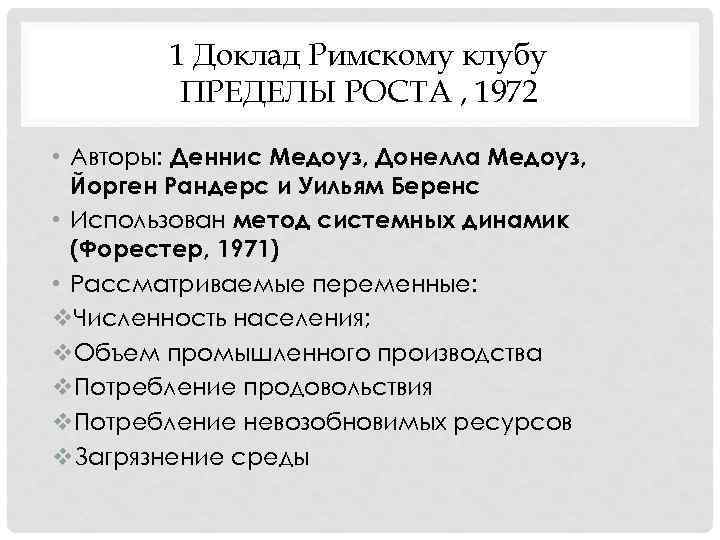 1 Доклад Римскому клубу ПРЕДЕЛЫ РОСТА , 1972 • Авторы: Деннис Медоуз, Донелла Медоуз, Йорген Рандерс и Уильям Беренс • Использован метод системных динамик (Форестер, 1971) • Рассматриваемые переменные: v. Численность населения; v. Объем промышленного производства v. Потребление продовольствия v. Потребление невозобновимых ресурсов v. Загрязнение среды