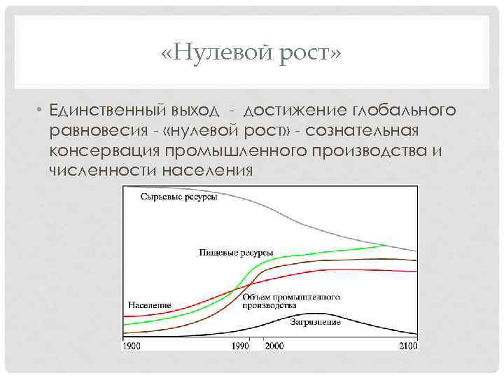 «Нулевой рост» • Единственный выход - достижение глобального равновесия - «нулевой рост» - сознательная консервация промышленного производства и численности населения