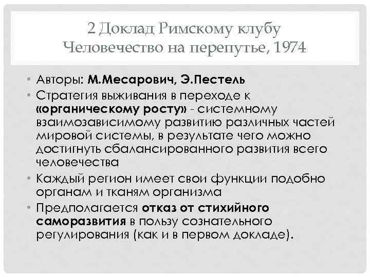 2 Доклад Римскому клубу Человечество на перепутье, 1974 • Авторы: М. Месарович, Э. Пестель • Стратегия выживания в переходе к «органическому росту» - системному взаимозависимому развитию различных частей мировой системы, в результате чего можно достигнуть сбалансированного развития всего человечества • Каждый регион имеет свои функции подобно органам и тканям организма • Предполагается отказ от стихийного саморазвития в пользу сознательного регулирования (как и в первом докладе).