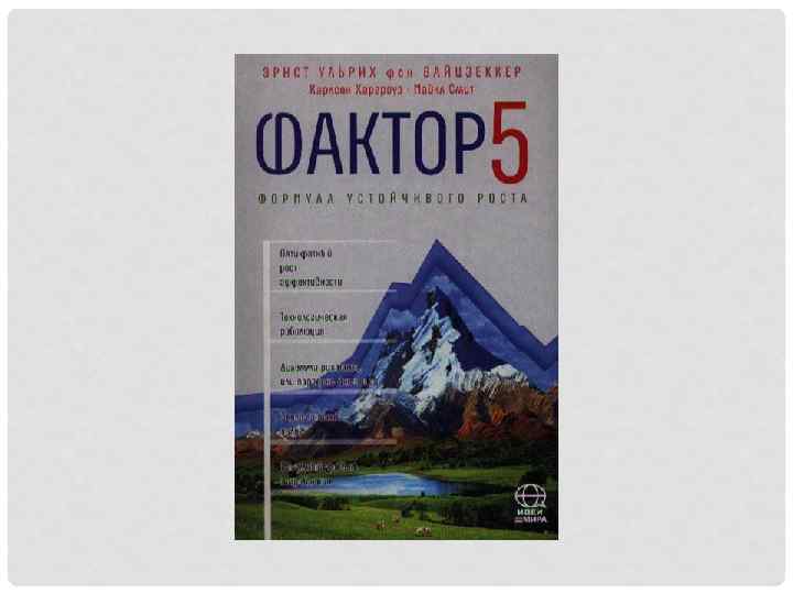 Доклад Римскому клубу «Фактор четыре. Затрат — половина, отдача — двойная» , 1997 • Авторы: Вайцзеккер Э. , Ловинс Л. • Основной вывод: современная цивилизация достигла уровня развития, на котором рост производства фактически во всех отраслях хозяйства способен осуществляться в условиях прогрессирующей экономики без привлечения дополнительных ресурсов и энергии. Человечество «может жить в два раза богаче, расходуя лишь половину ресурсов