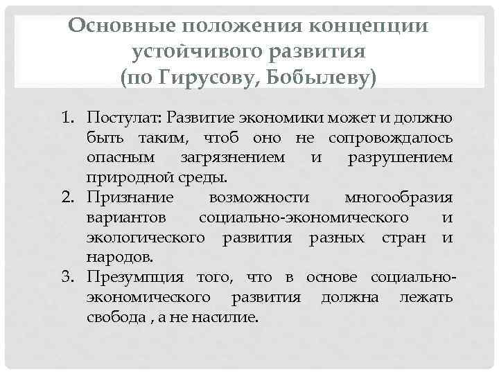 Основные положения концепции устойчивого развития (по Гирусову, Бобылеву) 1. Постулат: Развитие экономики может и должно быть таким, чтоб оно не сопровождалось опасным загрязнением и разрушением природной среды. 2. Признание возможности многообразия вариантов социально-экономического и экологического развития разных стран и народов. 3. Презумпция того, что в основе социальноэкономического развития должна лежать свобода , а не насилие.