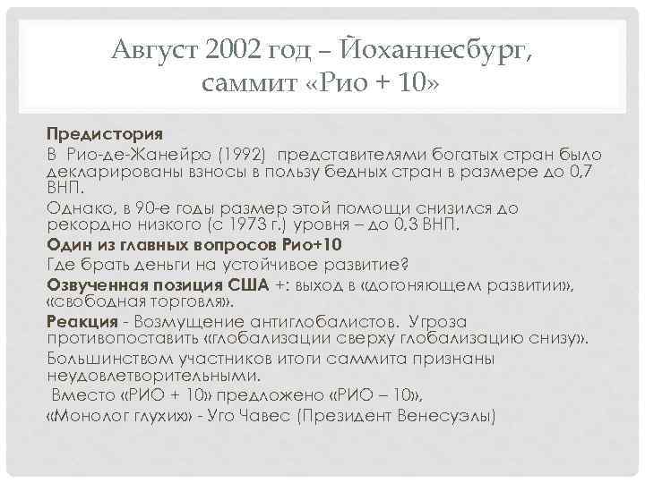 Август 2002 год – Йоханнесбург, саммит «Рио + 10» Предистория В Рио-де-Жанейро (1992) представителями богатых стран было декларированы взносы в пользу бедных стран в размере до 0, 7 ВНП. Однако, в 90 -е годы размер этой помощи снизился до рекордно низкого (с 1973 г. ) уровня – до 0, 3 ВНП. Один из главных вопросов Рио+10 Где брать деньги на устойчивое развитие? Озвученная позиция США +: выход в «догоняющем развитии» , «свободная торговля» . Реакция - Возмущение антиглобалистов. Угроза противопоставить «глобализации сверху глобализацию снизу» . Большинством участников итоги саммита признаны неудовлетворительными. Вместо «РИО + 10» предложено «РИО – 10» , «Монолог глухих» - Уго Чавес (Президент Венесуэлы)