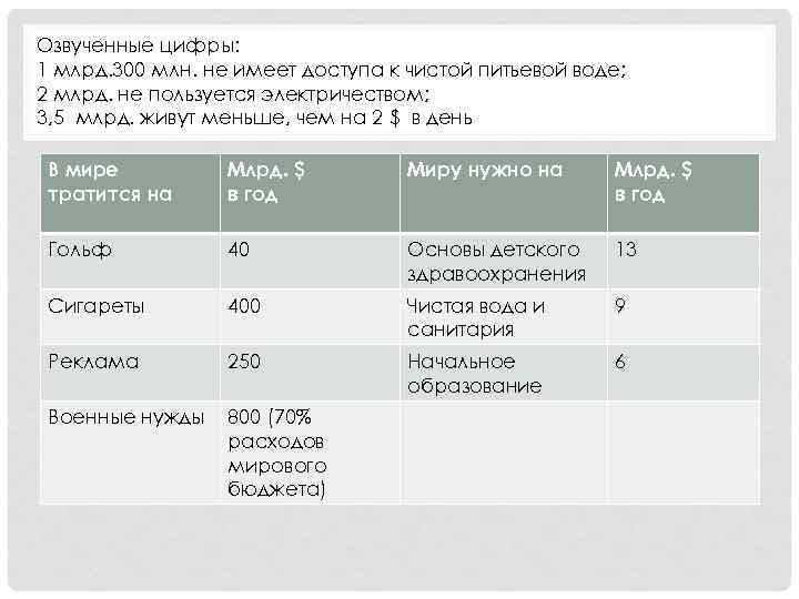 Озвученные цифры: 1 млрд. 300 млн. не имеет доступа к чистой питьевой воде; 2 млрд. не пользуется электричеством; 3, 5 млрд. живут меньше, чем на 2 $ в день В мире тратится на Млрд. $ в год Миру нужно на Млрд. $ в год Гольф 40 Основы детского здравоохранения 13 Сигареты 400 Чистая вода и санитария 9 Реклама 250 Начальное образование 6 Военные нужды 800 (70% расходов мирового Источник: Урсул А. Д. Переход России к устойчивому развитию бюджета)