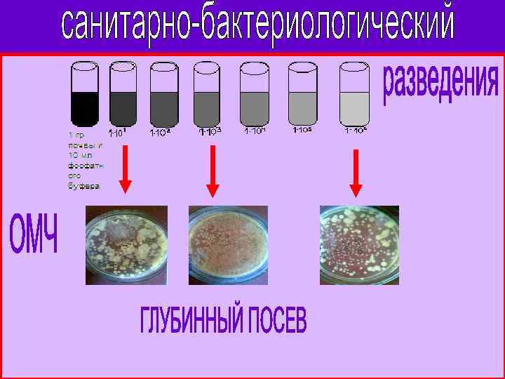 Микробиологические показатели ОМЧ – количество бактерий в 1 г почвы. Индекс бактерий группы кишечной палочки -количество БГКП в 1 г почвы. Коли-титр – объем почвы, в котором обнаружена 1 бактерия E. сoli. Перфрингенс-титр -наименьший объем почвы в г, в котором обнаружена 1 бактерия Clostridium perfringens.