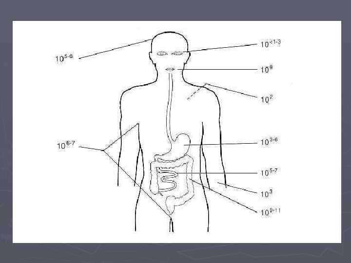 Состав нормальной микрофлоры тела человека Кишечник 1. Преобладают: § § § бифидобактерии, лактобактерии, бактероиды. В большом количество: 2. § § E. сoli, энтерококк. В небольшом количестве: 3. § § др. энтеробактерии, стафилококки, кандиды, клостридии.