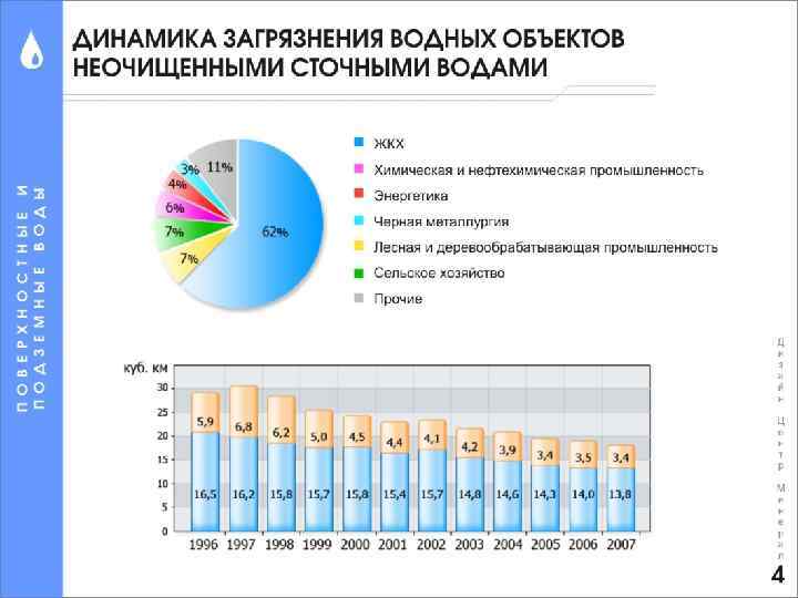 Загрязнение и истощение поверхностных водных объектов Крупнейшим загрязнителем воды в РФ стал комплекс ЖКХ. Незначительное снижение объема загрязнения поверхностных водных объектов произошло из-за сокращения поливных площадей при орошении и уменьшение количества водопользователей.