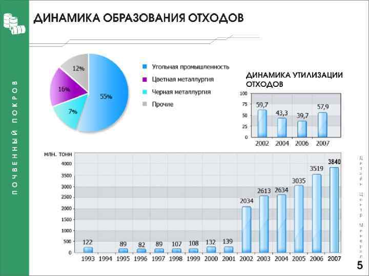 Отходы добывающих отраслей промышленности На территории России при добыче минерального сырья нарушено около 12% земель, при этом половина нарушенных земель находится в бедственном состоянии в связи с размещением отходов или с их неблагоприятным воздействием на природную среду в зонах, прилегающих к скоплениям отходов.