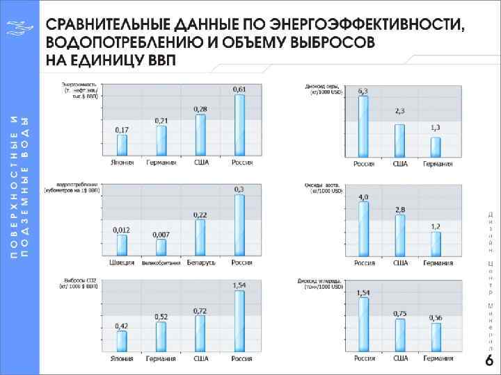 Каков вектор движения ? УСТОЙЧИВОЕ РАЗВИТИЕ ? Экономически развитые страны живут в логике показателей устойчивого развития (сколько воды, газа, нефти тратится на единицу ВВП, какой объем загрязнения приходится на единицу продукции). НАРАСТАНИЕ КРИЗИСА ? - по энергоэффективности РФ отстает от ЕС в 5 раз, - по выбросам CO 2 в 4 раза, - по водопотреблению в 50 раз, - по выбросам SO 2, NOX, CO 2 на единицу продукции РФ в несколько раз превышает показатели в других странах.