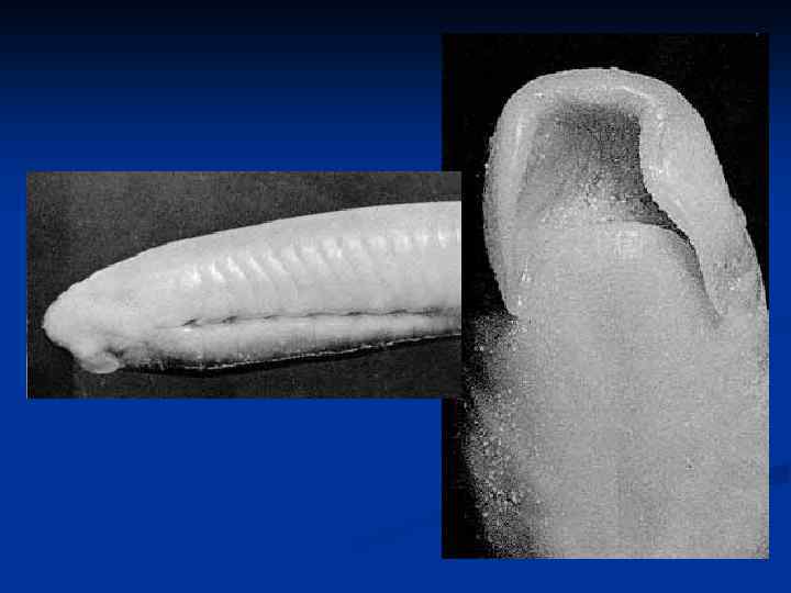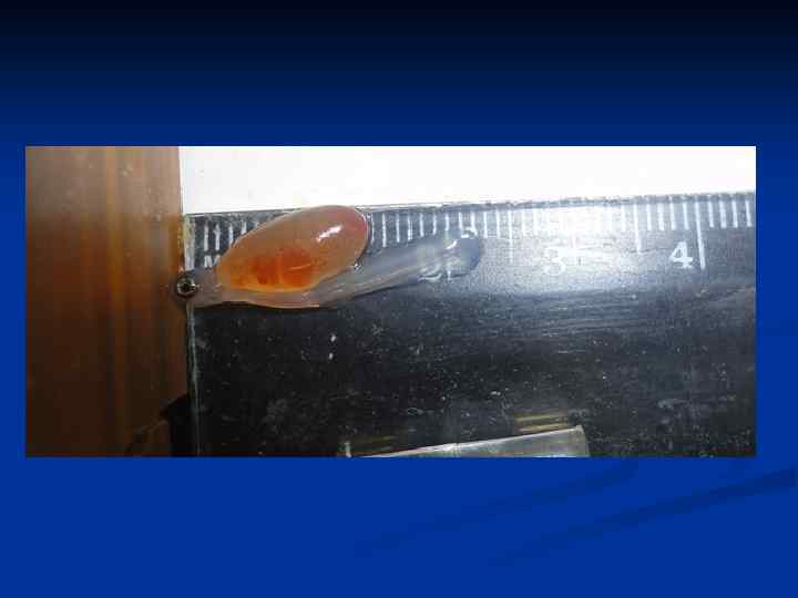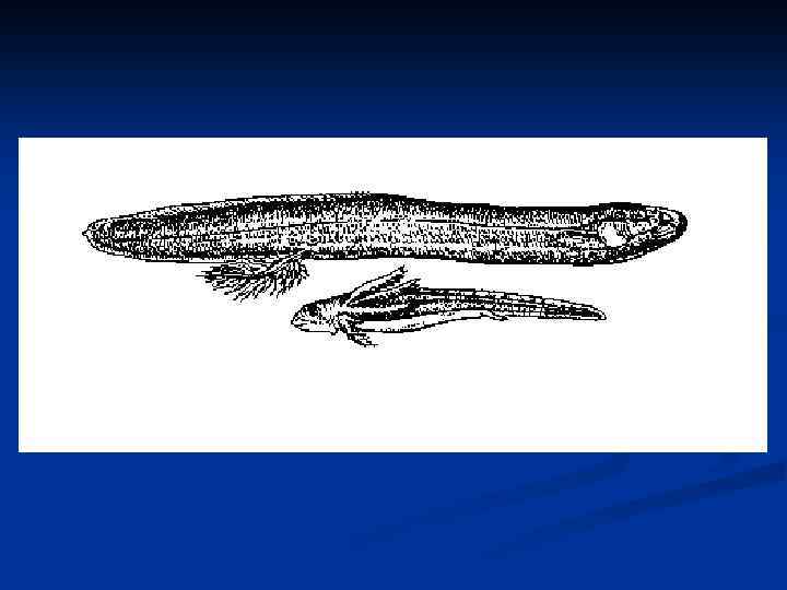 Эмбриогенез круглоротых n Эмбриональный период миноги продолжается от 3 -4 до 10 -11 дней. n Личинка (Ammocaetes) вылупляется при длине 3 -4 мм (редуцированы органы зрения, пищеварительная система). Имеет провизорный орган «парус» , совмещающий функции дыхания и питания. n n После резорбции желтка, находящегося в печени, увеличиваются в 2 раза и зарываются в ил. n Дышат всей поверхностью тела. Через 4 -5 лет происходит метаморфоз.