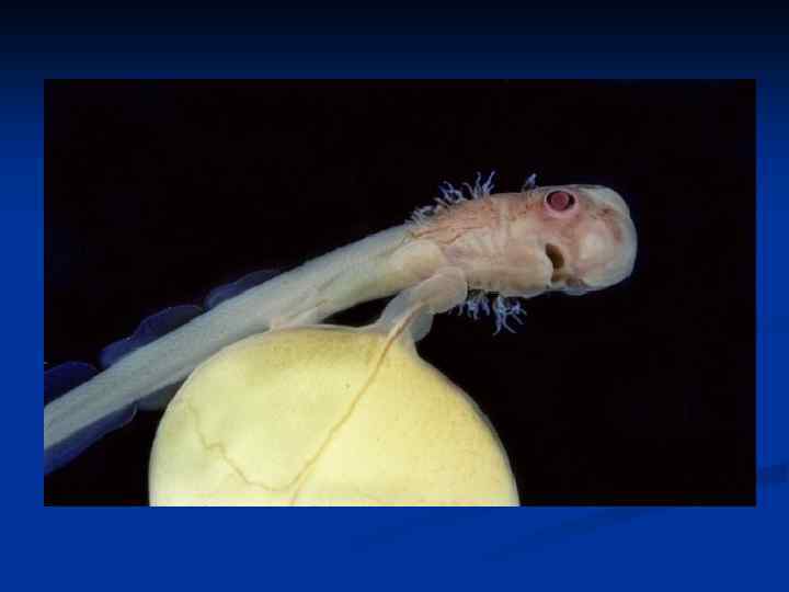 Костистые рыбы n Вылупление связано с функционированием железы вылупления. n Момент выклева зависит от температуры и других внешних условий. n Вылупление личинки отличается большим разнообразием, отражающим видовую специфичность. У многих имеется отрицательный фототаксис. n В случает недостатка в воде происходит преждевременно. кислорода, выклев
