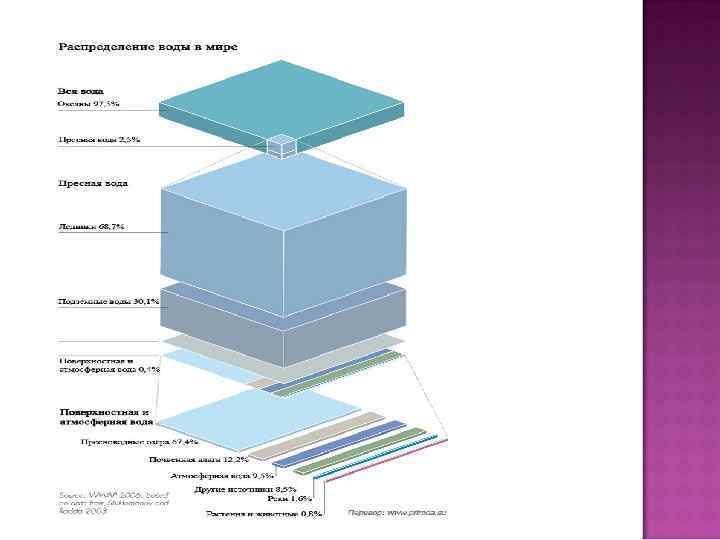 Вода занимает 70, 8% поверхности земного шара, а суша — только 29, 2%. 97. 5% всех запасов воды на планете Земля приходится на соленые воды морей и океанов. Пресная вода составляет только 2. 5% мировых запасов. 75% пресной воды "заморожено" в горных ледниках и полярных шапках, еще 24% находится под землей в виде грунтовых вод, а еще 0. 5% "рассредоточено" в почве в виде влаги.