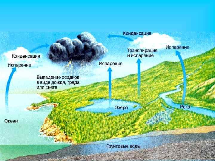 состоит из следующих процессов: - испарения; - осаждения; - поверхностных и подземных стоков. Объем воды мирового океана – 1 млн. 370 тыс. км 3 (подземные воды, открытые источники, полярные ледники, почвенная влага, пары атмосферы и др. ).