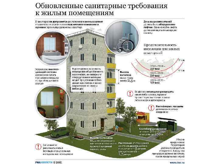 • Жилые здания размещают с учетом инсоляции и гигиенических требований к естественной освещенности. • Объекты общественного назначения, встроенные в жилые здания, не должны оказывать вредного влияния на человека, иметь входы, изолированные от жилой части здания, и обеспечивать соблюдение гигиенических нормативов.