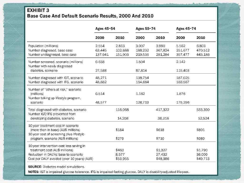 The Diabetes Cost-Benefit Model (Stephen Colaqiury and Agnes E. Walker) • Цель: определить издержки и выгоды национальной программы Австралии в области профилактики диабета • Учитывает: возраст, пол, степень диабета, расходы на лечение
