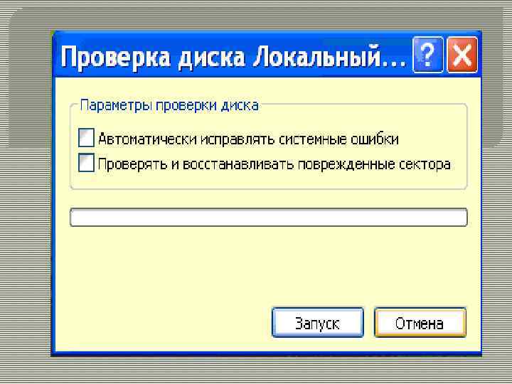 Проверка диска Служебная программа проверка диска предназначена для обнаружения ошибок файловой системы и повреждения секторов на жестком диске. Для того чтобы запустить программу проверка диска необходимо выполнить следующее: В окне Мой компьютер выберите диск, который необходимо проверить Выберите команду Свойства диска из контекстного меню В появившемся окне диалога на вкладке Сервис выберите Выполнить проверку (проверка тома на наличие ошибок) В появившемся окне диалога Проверка диска установите флажки Автоматически проверять системные ошибки, а также Проверять и восстанавливать поврежденные сектора и щелкните на кнопке Запуск. Перед запуском проверки диска необходимо закрыть все содержащие в нем файлы.