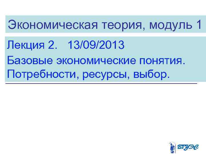 Экономическая теория, модуль 1 Лекция 2. 13/09/2013 Базовые экономические понятия. Потребности, ресурсы, выбор.