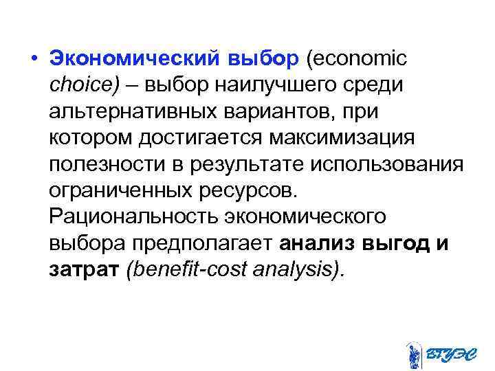 • Экономический выбор (economic choice) – выбор наилучшего среди альтернативных вариантов, при котором достигается максимизация полезности в результате использования ограниченных ресурсов. Рациональность экономического выбора предполагает анализ выгод и затрат (benefit-cost analysis).