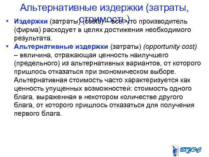 • Альтернативные издержки (затраты, стоимость) Издержки (затраты) (costs) – все, что производитель (фирма) расходует в целях достижения необходимого результата. • Альтернативные издержки (затраты) (opportunity cost) – величина, отражающая ценность наилучшего (предельного) из альтернативных вариантов, от которого пришлось отказаться при экономическом выборе. Альтернативная стоимость часто характеризуется как ценность упущенных возможностей: стоимость одного блага, выраженная в некотором количестве другого блага, от которого пришлось отказаться для получения первого блага.