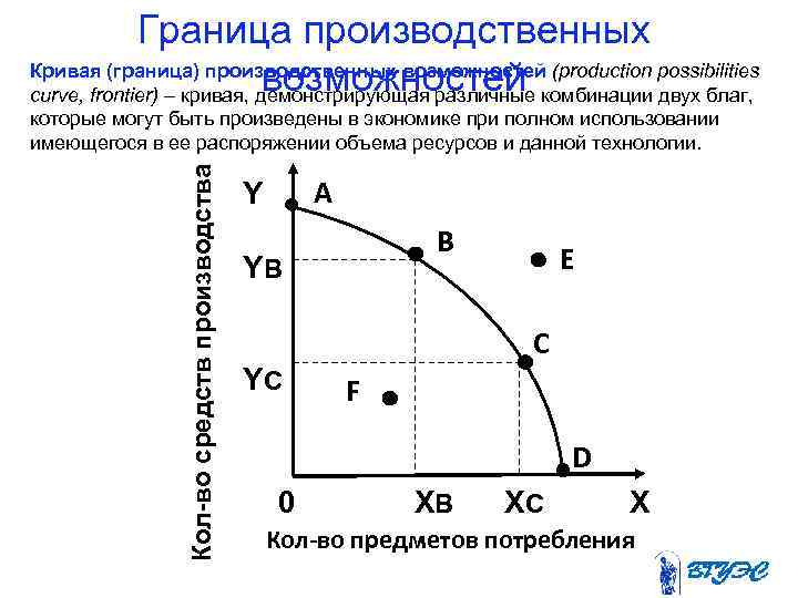 Граница производственных Кривая (граница) производственных возможностей (production possibilities возможностей curve, frontier) – кривая, демонстрирующая различные комбинации двух благ, Кол-во средств производства которые могут быть произведены в экономике при полном использовании имеющегося в ее распоряжении объема ресурсов и данной технологии. А Y В YB E С YC F D 0 XB XC X Кол-во предметов потребления