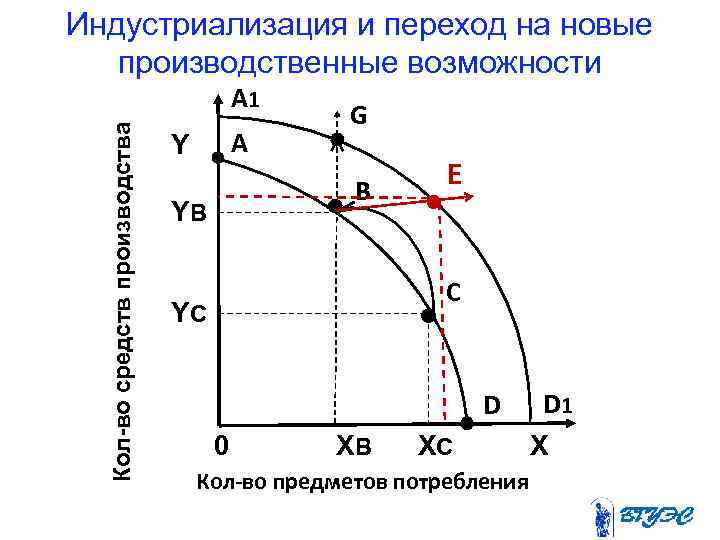 Индустриализация и переход на новые производственные возможности Кол-во средств производства А 1 А Y YB G В E С YC D 0 XB XC Кол-во предметов потребления D 1 X