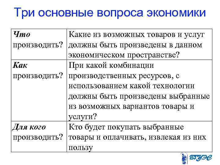 Три основные вопроса экономики Что Какие из возможных товаров и услуг производить? должны быть произведены в данном экономическом пространстве? Как При какой комбинации производить? производственных ресурсов, с использованием какой технологии должны быть произведены выбранные из возможных вариантов товары и услуги? Для кого Кто будет покупать выбранные производить? товары и оплачивать, извлекая из них пользу