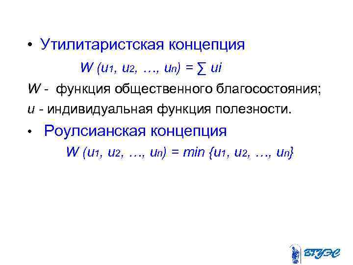 • Утилитаристская концепция W (u 1, u 2, …, un) = ∑ ui W функция общественного благосостояния; и - индивидуальная функция полезности. • Роулсианская концепция W (u 1, u 2, …, un) = min {u 1, u 2, …, un}