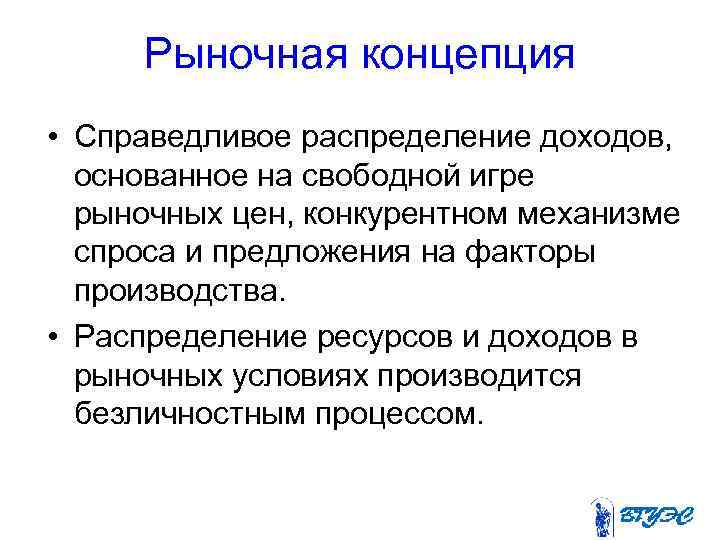 Рыночная концепция • Справедливое распределение доходов, основанное на свободной игре рыночных цен, конкурентном механизме спроса и предложения на факторы производства. • Распределение ресурсов и доходов в рыночных условиях производится безличностным процессом.