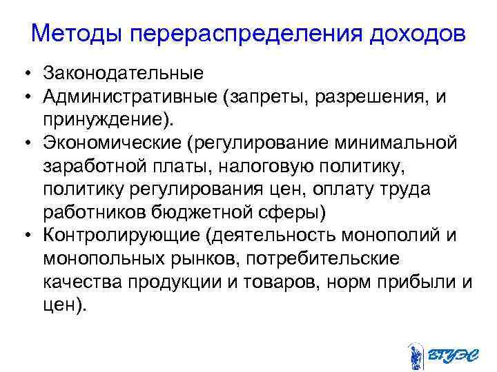 Методы перераспределения доходов • Законодательные • Административные (запреты, разрешения, и принуждение). • Экономические (регулирование минимальной заработной платы, налоговую политику, политику регулирования цен, оплату труда работников бюджетной сферы) • Контролирующие (деятельность монополий и монопольных рынков, потребительские качества продукции и товаров, норм прибыли и цен).