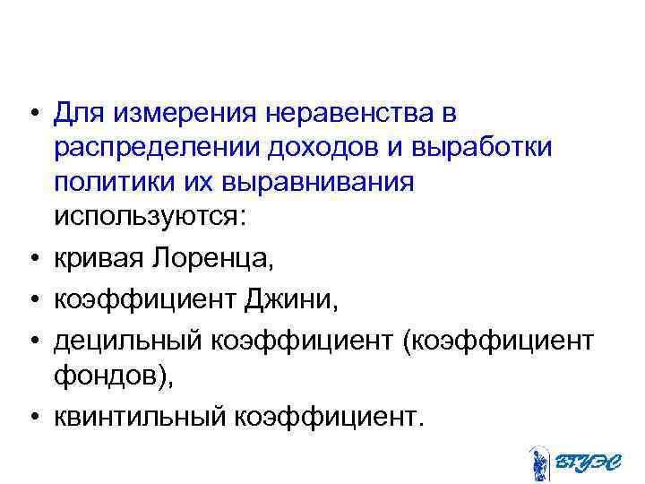 • Для измерения неравенства в распределении доходов и выработки политики их выравнивания используются: • кривая Лоренца, • коэффициент Джини, • децильный коэффициент (коэффициент фондов), • квинтильный коэффициент.
