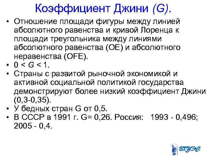 Коэффициент Джини (G). • Отношение площади фигуры между линией абсолютного равенства и кривой Лоренца к площади треугольника между линиями абсолютного равенства (OE) и абсолютного неравенства (OFE). • 0 < G < 1. • Страны с развитой рыночной экономикой и активной социальной политикой государства демонстрируют более низкий коэффициент Джини (0, 35). • У бедных стран G от 0, 5. • В СССР в 1991 г. G= 0, 26. Россия: 1993 0, 496; 2005 0, 4.
