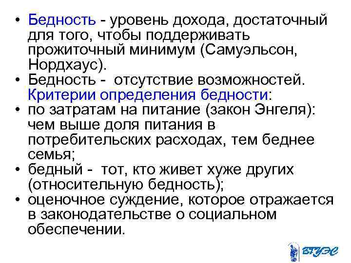 • Бедность уровень дохода, достаточный для того, чтобы поддерживать прожиточный минимум (Самуэльсон, Нордхаус). • Бедность отсутствие возможностей. Критерии определения бедности: • по затратам на питание (закон Энгеля): чем выше доля питания в потребительских расходах, тем беднее семья; • бедный тот, кто живет хуже других (относительную бедность); • оценочное суждение, которое отражается в законодательстве о социальном обеспечении.