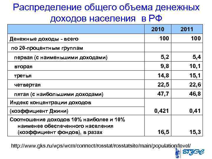 Распределение общего объема денежных доходов населения в РФ 2010 100 Денежные доходы - всего по 20 -процентным группам 2011 100 первая (с наименьшими доходами) 5, 2 5, 4 вторая 9, 8 10, 1 третья 14, 8 15, 1 четвертая 22, 5 22, 6 пятая (с наибольшими доходами) 47, 7 46, 8 0, 421 0, 41 16, 5 15, 3 Индекс концентрации доходов (коэффициент Джини) Соотношение доходов 10% наиболее и 10% наименее обеспеченного населения (коэффициент фондов), в разах http: //www. gks. ru/wps/wcm/connect/rosstatsite/main/population/level/