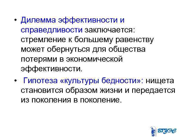 • Дилемма эффективности и справедливости заключается: стремление к большему равенству может обернуться для общества потерями в экономической эффективности. • Гипотеза «культуры бедности» : нищета становится образом жизни и передается из поколения в поколение.