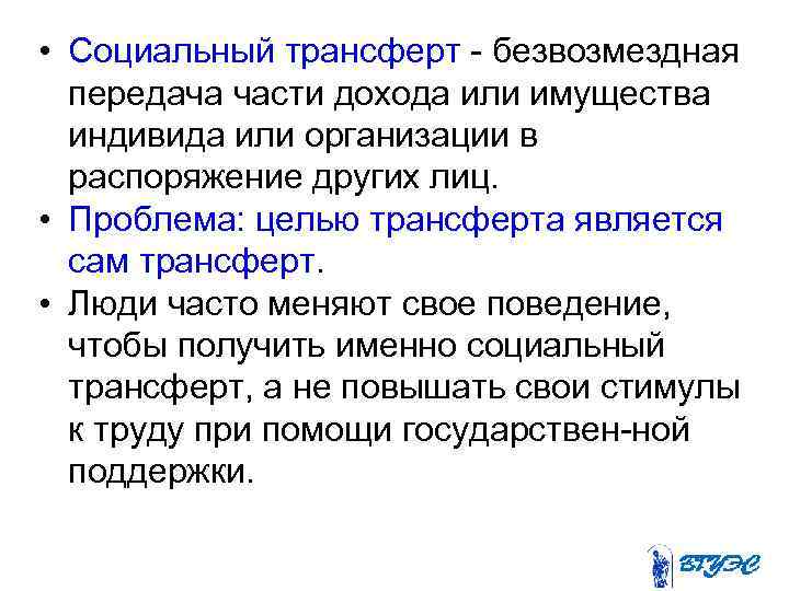 • Социальный трансферт безвозмездная передача части дохода или имущества индивида или организации в распоряжение других лиц. • Проблема: целью трансферта является сам трансферт. • Люди часто меняют свое поведение, чтобы получить именно социальный трансферт, а не повышать свои стимулы к труду при помощи государствен ной поддержки.