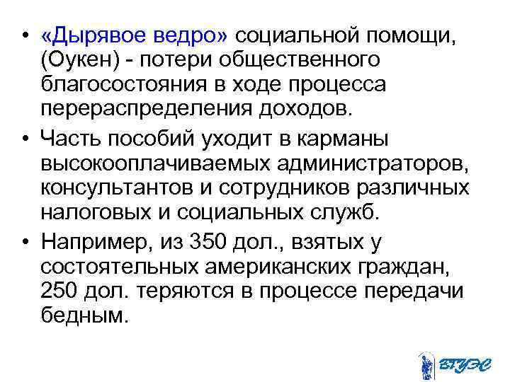 • «Дырявое ведро» социальной помощи, (Оукен) потери общественного благосостояния в ходе процесса перераспределения доходов. • Часть пособий уходит в карманы высокооплачиваемых администраторов, консультантов и сотрудников различных налоговых и социальных служб. • Например, из 350 дол. , взятых у состоятельных американских граждан, 250 дол. теряются в процессе передачи бедным.