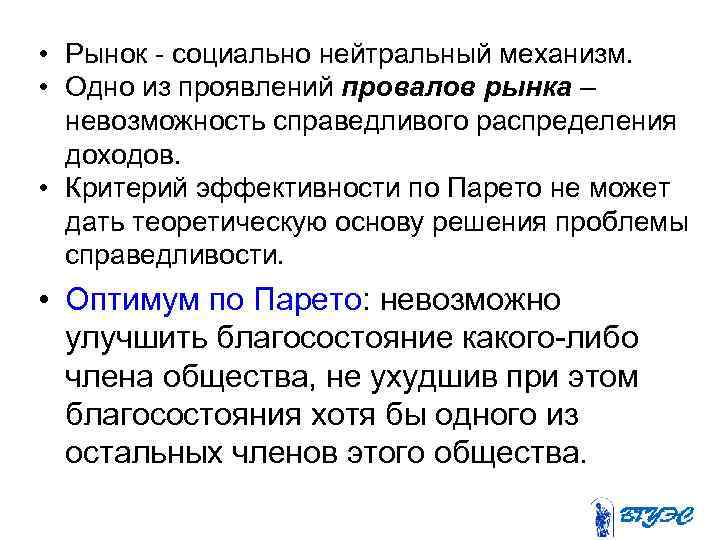 • Рынок социально нейтральный механизм. • Одно из проявлений провалов рынка – невозможность справедливого распределения доходов. • Критерий эффективности по Парето не может дать теоретическую основу решения проблемы справедливости. • Оптимум по Парето: невозможно улучшить благосостояние какого либо члена общества, не ухудшив при этом благосостояния хотя бы одного из остальных членов этого общества.