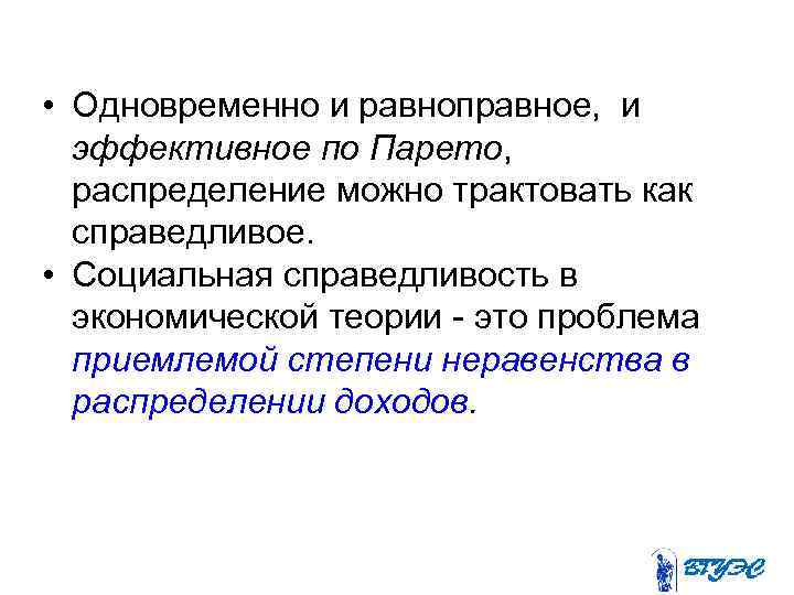 • Одновременно и равноправное, и эффективное по Парето, распределение можно трактовать как справедливое. • Социальная справедливость в экономической теории это проблема приемлемой степени неравенства в распределении доходов.