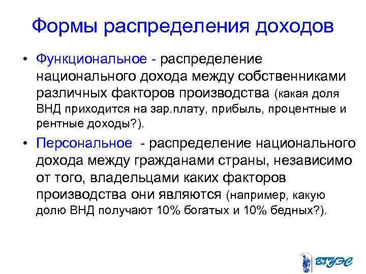 Формы распределения доходов • Функциональное распределение национального дохода между собственниками различных факторов производства (какая доля ВНД приходится на зар. плату, прибыль, процентные и рентные доходы? ). • Персональное распределение национального дохода между гражданами страны, независимо от того, владельцами каких факторов производства они являются (например, какую долю ВНД получают 10% богатых и 10% бедных? ).