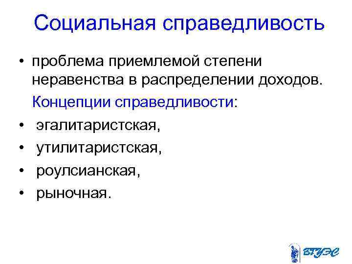 Социальная справедливость • проблема приемлемой степени неравенства в распределении доходов. Концепции справедливости: • эгалитаристская, • утилитаристская, • роулсианская, • рыночная.