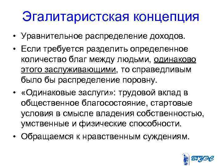 Эгалитаристская концепция • Уравнительное распределение доходов. • Если требуется разделить определенное количество благ между людьми, одинаково этого заслуживающими, то справедливым было бы распределение поровну. • «Одинаковые заслуги» : трудовой вклад в общественное благосостояние, стартовые условия в смысле владения собственностью, умственные и физические способности. • Обращаемся к нравственным суждениям.