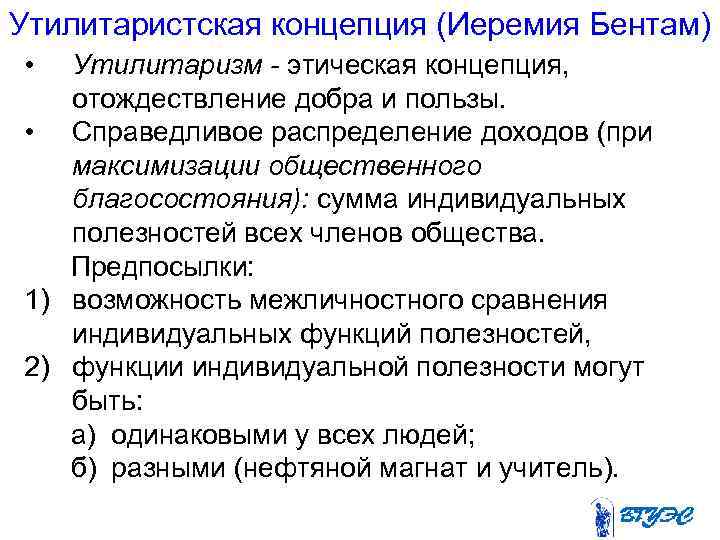 Утилитаристская концепция (Иеремия Бентам) • Утилитаризм - этическая концепция, отождествление добра и пользы. • Справедливое распределение доходов (при максимизации общественного благосостояния): сумма индивидуальных полезностей всех членов общества. Предпосылки: 1) возможность межличностного сравнения индивидуальных функций полезностей, 2) функции индивидуальной полезности могут быть: а) одинаковыми у всех людей; б) разными (нефтяной магнат и учитель).