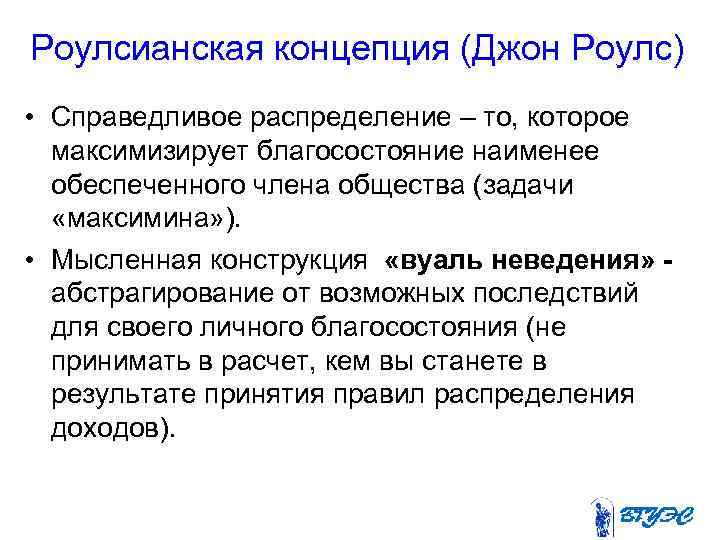Роулсианская концепция (Джон Роулс) • Справедливое распределение – то, которое максимизирует благосостояние наименее обеспеченного члена общества (задачи «максимина» ). • Мысленная конструкция «вуаль неведения» - абстрагирование от возможных последствий для своего личного благосостояния (не принимать в расчет, кем вы станете в результате принятия правил распределения доходов).