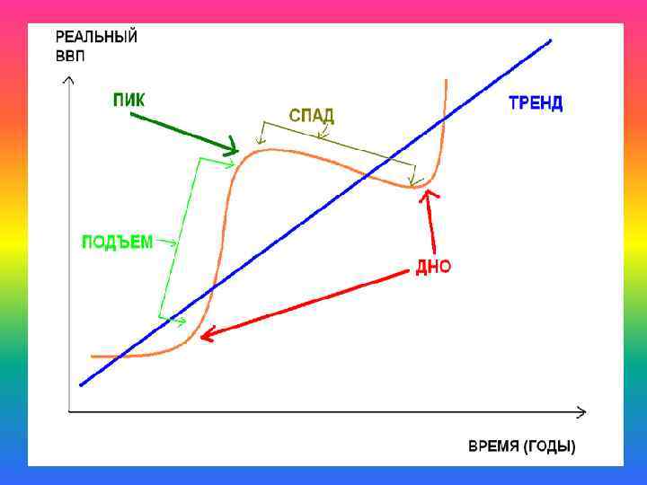 Экономический цикл состоит из четырех фаз: 1) подъем 2) пик 3) спад 4)дно