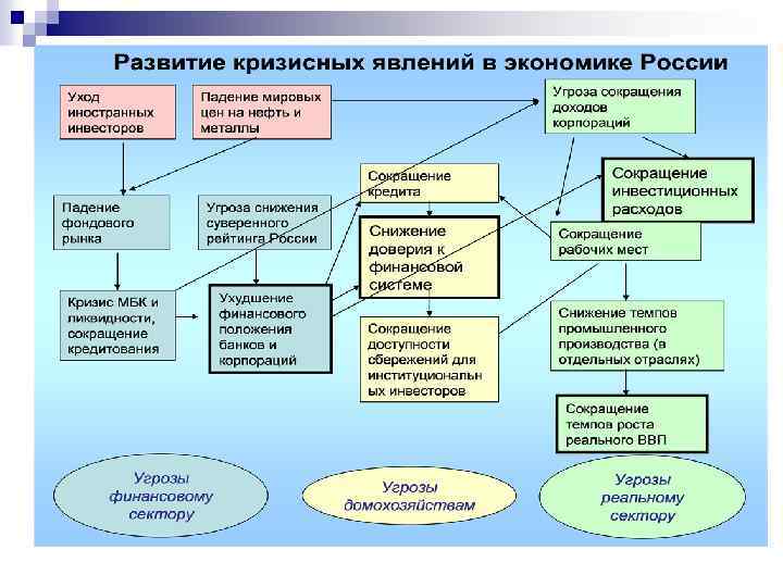 Возможности n n n n Перераспределение собственности от неэффективных собственников. Сокращение избыточной занятости и замедление темпов роста заработной платы, повышение производительности труда, Появление стимулов к несырьевой специализации экономики, Сокращение импорта и повышение эффективности экспорта. Возможности для создания новых предприятий и отраслей. Развитие небанковских финансовых институтов (ссудносберегательных касс, кредитных кооперативов и проч. ), повышение устойчивости тех банков, которые закалятся во время кризиса. Пересмотр ряда амбициозных проектов, Повышение качества корпоративного управления.