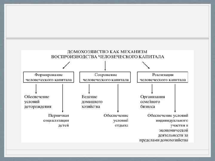 Функции домохозяйства • Определяющей для домохозяйства является функция воспроизводства (восполнения затрат и накопления) человеческого капитала. Понятием «человеческий капитал» обозначают совокупность неотрывных от человека знаний, навыков, опыта, реализуя которые индивид создает материальные условия для себя и своих близких.