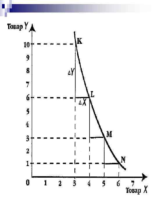 На графике показано, что по мере увеличения потребления товара X на каждую дополнительную единицу (ΔX) (движение от точки К к точке N) количество товара Y, от которого потребитель готов отказаться (ΔY), сокращается, т. е. предельная норма замещения убывает. Таким образом, чем менее дефицитным становится товар X, тем меньшим количеством товара Y мы готовы пожертвовать.