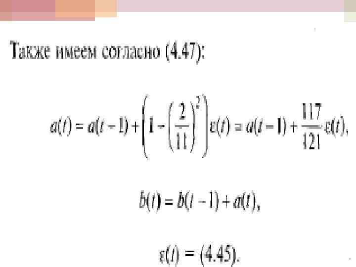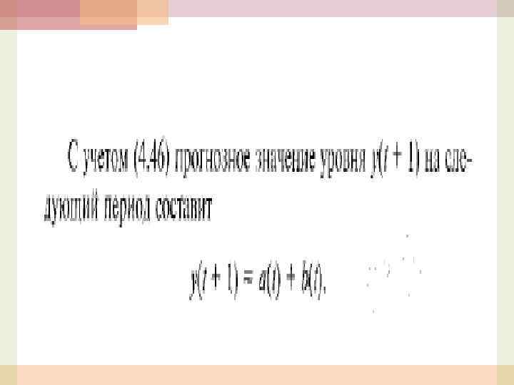 Уравнение адаптивной модели М 2 в линейном виде В линейном случае уравнение адаптивной модели М 2 есть (4. 46) {y(t+h)=a(t)h+b(t)} в которой: