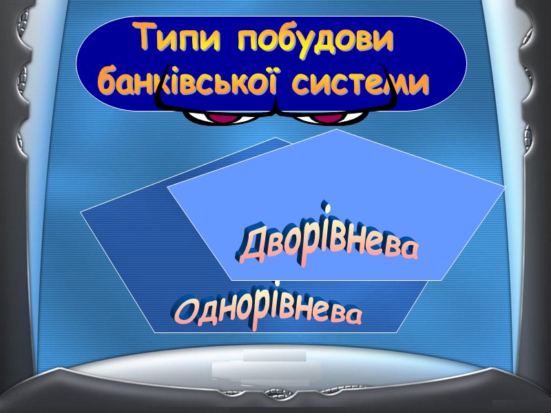 4.3. Банківська система Типи побудови банківської системи Функції Однорівнева Стабілізаційна Трансформаційна Дворівнева Створення грошей і регулювання грошової маси