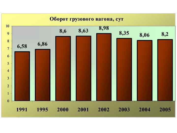 Показатели использования вагонов • • • - Статическая нагрузка грузового вагона - Динамическая нагрузка груженого вагона - Динамическая нагрузка вагона рабочего парка - Средняя масса вагона брутто - Оборот грузового вагона - Полный рейс вагона - Груженый рейс вагона - Коэффициент порожнего пробега вагонов - Коэффициент местной работы - Вагонное плечо - Среднесуточный пробег грузового вагона - Суточная производительность грузового вагона