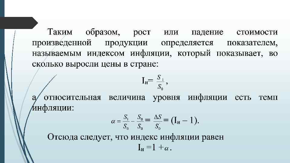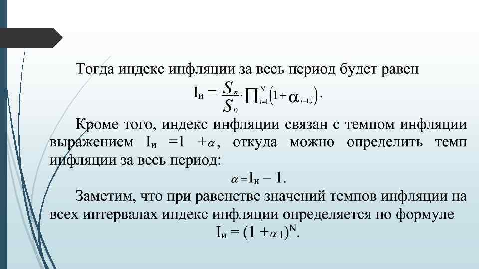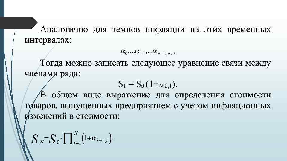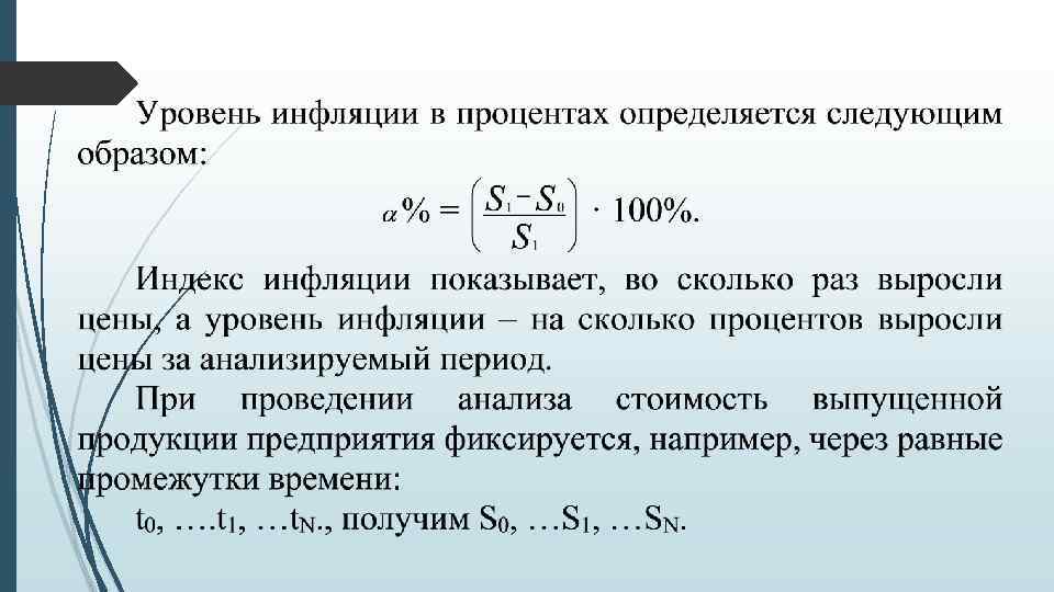 Экономико-математические модели инфляции В современных условиях особую актуальность приобретает принятие финансовых решений на основе правильного ведения учета, анализа и отчетности в условиях инфляции. Это связано, прежде всего, с тем, что процесс обесценения рубля не раз застигал врасплох многие российские предприятия и финансовые решения претерпевали полный крах. Из-за снижения покупательной способности рубля и повышения общего уровня цен инвестор может потерять часть дохода (особенно это касается дебиторской задолженности), а заемщик соответственно может выиграть за счет погашения задолженности деньгами сниженной покупательной способности (кредиторская задолженность). В финансовом менеджменте обычно рассчитывают показатели номинальные (в текущих ценах) и реальные (рассчитанные с учетом инфляции в сопоставимых ценах базисного периода).